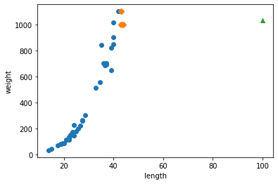 KNN์๊ณ ๋ฆฌ์ฆ์ ํ๊ณ๋ ์ด์์ ๊ฐ์๋ก ์์ธก์ ํ๋ ๊ฒ์ด๋ค. ์ ๊ทธ๋ํ๋, ๊ธฐ์กด ๋ฐ์ดํฐ์๋ ๋ค๋ฅธ ๋ฐ์ดํฐ๋ฅผ ๋ฃ์์ ๋ ๋ฐ์ํ๋ ๋ฌธ์ ์ ์ ๋ณด์ฌ์ค๋ค. ์ด๋ก์ ์ผ๊ฐํ(โ๏ธ)์ ๊ธธ์ด๋ฅผ 50์ผ๋ก ์์ธกํ์ ๋ ์๊ณ ๋ฆฌ์ฆ์ด ์์ธกํ ๋ฌด๊ฒ์ด๋ค. ์ฃผํฉ์ ๋ง๋ฆ๋ชจ(๐ถ)๋ ์์ธก๊ฐ ์ฃผ๋ณ์์ ๊ฐ์ฅ ๊ฐ๊น์ด ์ด์ 3๊ฐ์ด๋ค. (์ด์์ ๊ฐ์๋ฅผ 3๊ฐ ์ค์ ํ์๋ค.) ๊ธธ์ด๊ฐ ๊ธธ์ด์ง์ ๋น๋กํ์ฌ ๋ฌด๊ฒ๊ฐ ๋์ด๋๋ ๊ฒ์ด ์๋๋ผ ์ด์์ ์ํ๋ก ์์ธกํ๊ธฐ ๋๋ฌธ์, ๊ธธ์ด๊ฐ 500์ด์ฌ๋ ๋ฌด๊ฒ๋ฅผ ์ฝ 1000์ผ๋ก ์์ธกํ ๊ฒ์ด๋ค.