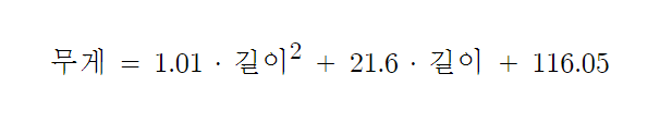 x²์ ๊ณ์(a)๋ 1.01433211, x์ ๊ณ์(b)๋ -21.55792498, y์ ํธ์ 116.05021078278276์ด๋ค.