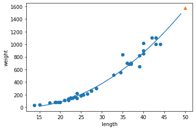 KNN ํ๊ท ์๊ณ ๋ฆฌ์ฆ์ 50cm์ ๋ฌด๊ฒ๋ฅผ 1033์ผ๋ก ์์ธกํ๊ณ , ์ ํ ํ๊ท ์๊ณ ๋ฆฌ์ฆ์ 1241๋ก ์์ธก์ ํ์๋ค. ์ข์ธก์ด ์์ํ ๊ฐ๋ณด๋ค๋ ์ฐ์ธก์ด ์์ํ ๊ฐ์ด ๋ ์ ๋ขฐ์ฑ์ด ๋๋ค. ํ์ง๋ง ์ฐ์ธก ๊ทธ๋ํ๋ฅผ ์์ธํ ๋ณธ๋ค๋ฉด ์ด์ํ ์ ์ ๋๋ ์ ์๋ค. ์ฐ์ธก ๊ทธ๋ํ์ ์ข์ธก ํ๋จ์ ๋ณด๋ฉด, ๊ทธ๋ํ๋ ํ ์์ด ๋ด๋ ค๊ฐ์ ์์๋ก ๊ฐ๋ค. ๊ธฐ์กด ๋ฐ์ดํฐ๋ ์ง์ ๊ทธ๋ํ๋ณด๋ค๋ ํ์ด์ง ๊ณก์ ๊ทธ๋ํ๊ฐ ๋ ๊ฐ๊น๋ค. ๊ณก์ ๊ทธ๋ํ๋ฅผ ๊ทธ๋ฆฌ๊ธฐ์ํด์๋ 2์ฐจ ๋ฐฉ์ ์์ ๊ทธ๋ํ๋ฅผ ๊ทธ๋ ค์ผ ํ๊ณ ์ด๋ฅผ ๋คํญ ํ๊ท๋ผ๊ณ ํ๋ค.