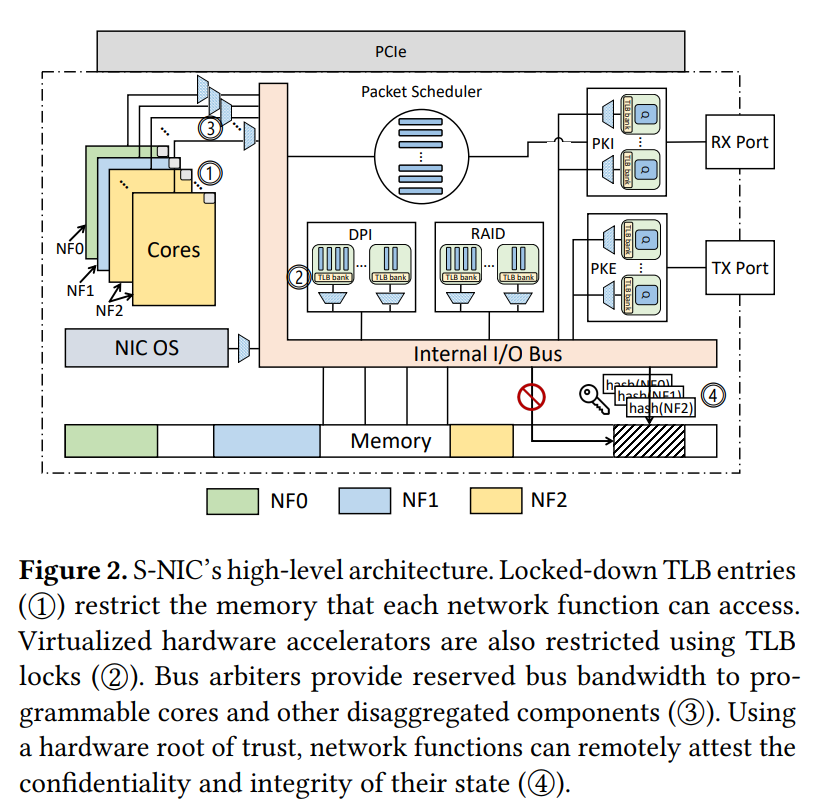 S-NIC은 virtual smart nic의 추상화를 사용함으로써 virtual smart nic에 각 network function을 바인딩한다. S-NIC은 network function들 간의 isolation을 위해 ISA-level과 microarchitecture-level 둘 다 다른 virtual smart nic 또는 nic os로부터 virtual smart nic의 상태를 숨긴다. 아래 figure2는 S-nic의 high-level architectur를 보여준다. 1번부터 4번까지 S-NIC의 isolation을 입증하는 S-NIC의 desig인데, 1번은 각 core의 TLB entry는 lock-down기능을 사용하여 각 network function이 사용할 수 있는 메모리를 제한한다. 2번에서도 가상화된 하드웨어 가속기에 lock기능을 사용하여 network function의 사용을 제한하며, 3번에서는 프로그래머블 코어와 다른 컴포넌트에서 transfer할 때 예약된 버스 bandwidth를 제공한다. 4번은 하드웨어 신뢰 루트를 사용하여 각 network function이 원격으로 자신의 무결성을 기밀성을 증명할 수 있도록 한다.