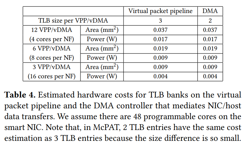 DIP, ZIP, RAID 가속기에 대해 총 TLB 하드웨어 비용을 합산하면, S-NIC은 512 TLB entries, 4-core A9를 고려할 때 die area가 최대 4.2%, 전력 소비가 5.3% 증가하였다. table3은 TLB bank를 구현하는데 필요한 비용으로 예를 들어 16cluster의 DPI는 TLB bank를 구현하기 위해 0.074mm2과 0.037W의 비용이 필요하다. 클러스터의 개수가 적어질수록 비용이 줄어든다.