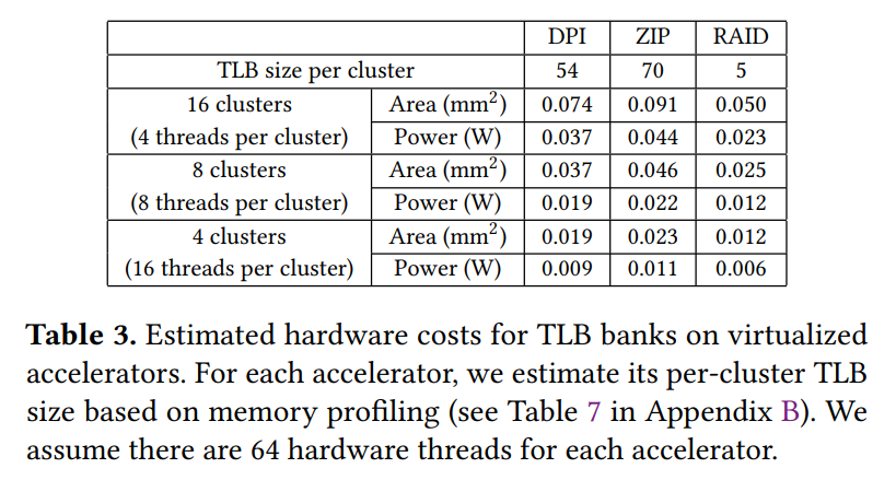 Table 3 → virtualized accelerators용 TLB로, accelerator type과 cluster size를 변경시킬 때의 변화를 보여준다.