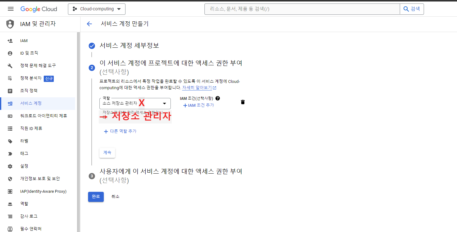 - ❗ 주의할 점 ❗ : 아래 이미지와 같이 "소스 저장소 관리자"가 아닌 "저장소 관리자"로 해야지 storage bucket에 대한 권한 문제가 발생하지 않는다.