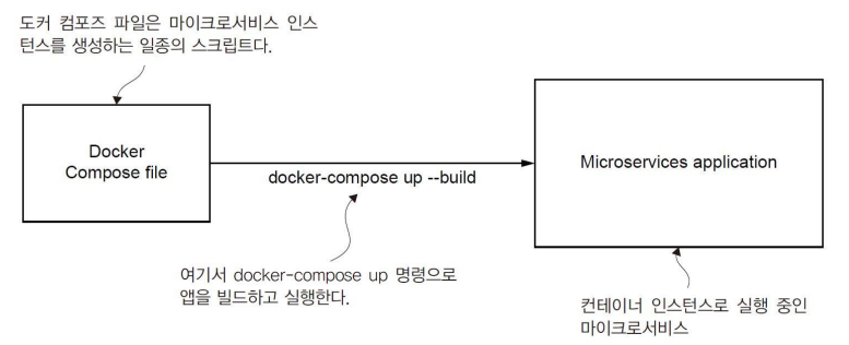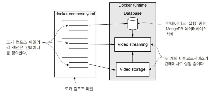 아래 이미지는 docker-compose.yml파일로 각 컨테이너를 정의하고 docker runtime에서 두 개의 마이크로서비스가 통합되어 실행한다.
