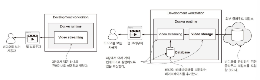 이전까지 Video streaming 하나의 앱을 컨테이너로 실행하고 있었다. 이번 실습에서는 여러 개의 컨테이너로 앱을 확장한다. ( Video straming → Video straming + Video storage + Database)