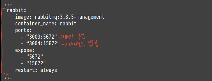 docker-compose.yml 파일에서 rabbit 도커 이미지를 활용하여 컨테이너를 만든다. 5672포트는 송수신에 사용할 포트이고 15672는 관리 대시보드 접근용 포트이다.