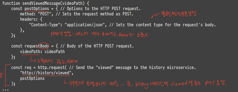 HTTP POST 요청을 만든 코드이다. http.post에 대한 필요한 헤더/바디 부분을 설정하고 videoPath라는 변수에 매개변수를 받아서 history 마이크로서비스에 viewed 메시지를 post 요청으로 보낸다. 이때 요청을 보낼 URL은 http://history/viewed로, 대상 마이크로서비스를 특정한다.