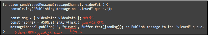 이름이 viewed인 queue를 지정해서 json으로 변환한 jsonMsg를 버퍼에 넣어 publish 호출