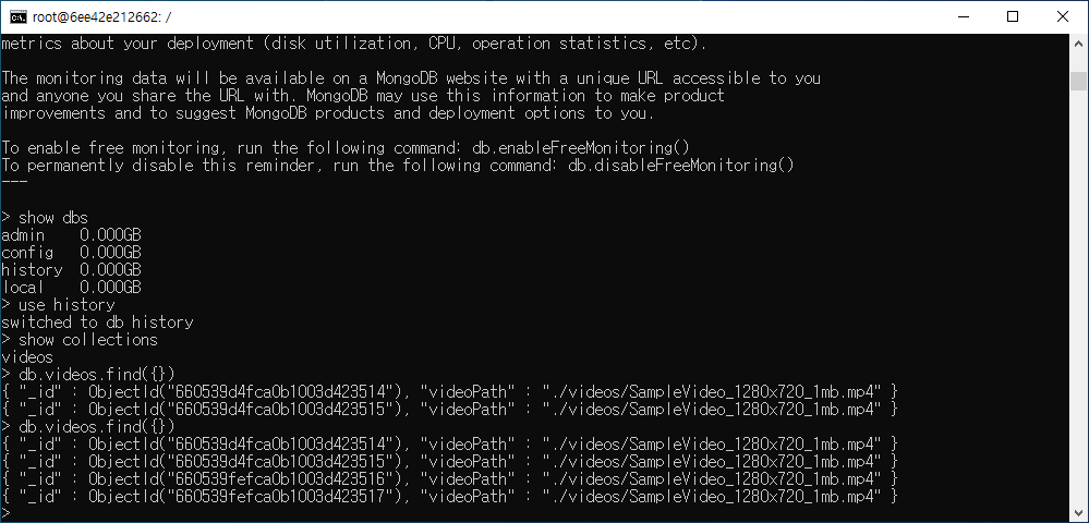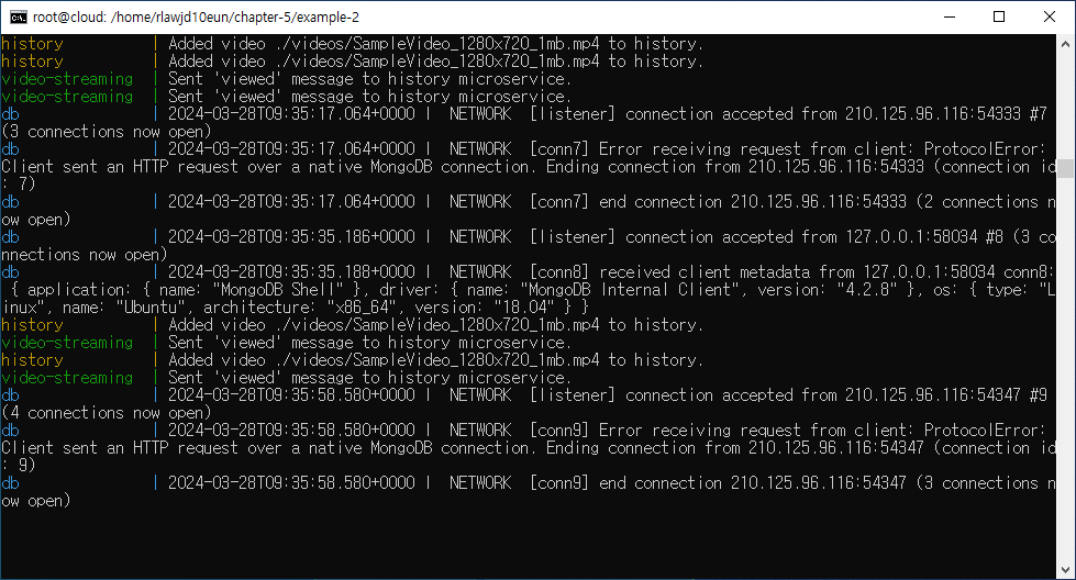 - DB에 접속해서 history 마이크로서비스의 데이터를 확인한다. (우측 사진을 보면 2개에서 4개로 늘어났는데 한 번 영상을 streaming할 때마다 해당경로에 대한 request와 파비콘 request 2개이기 때문에 2개씩 생성)