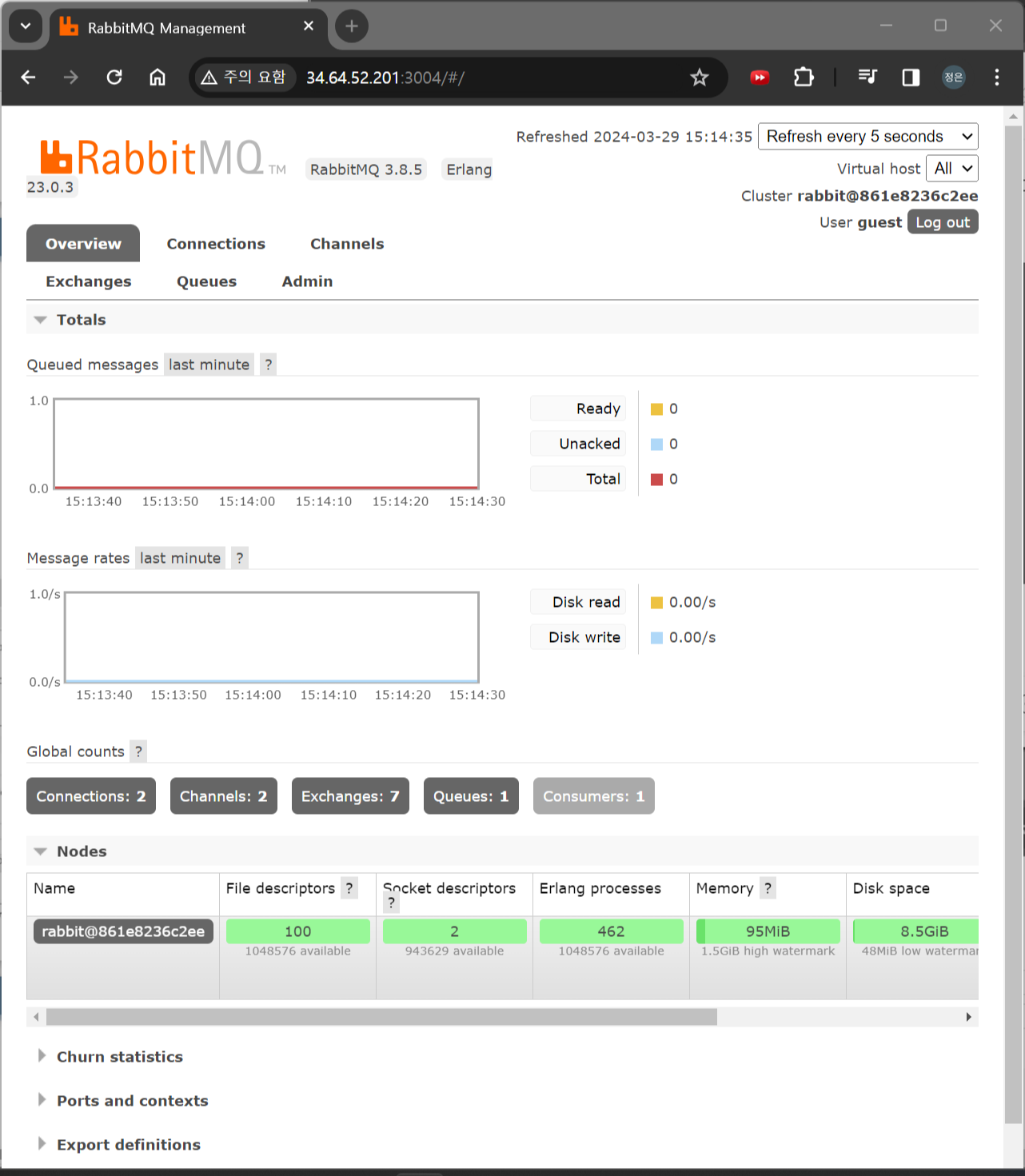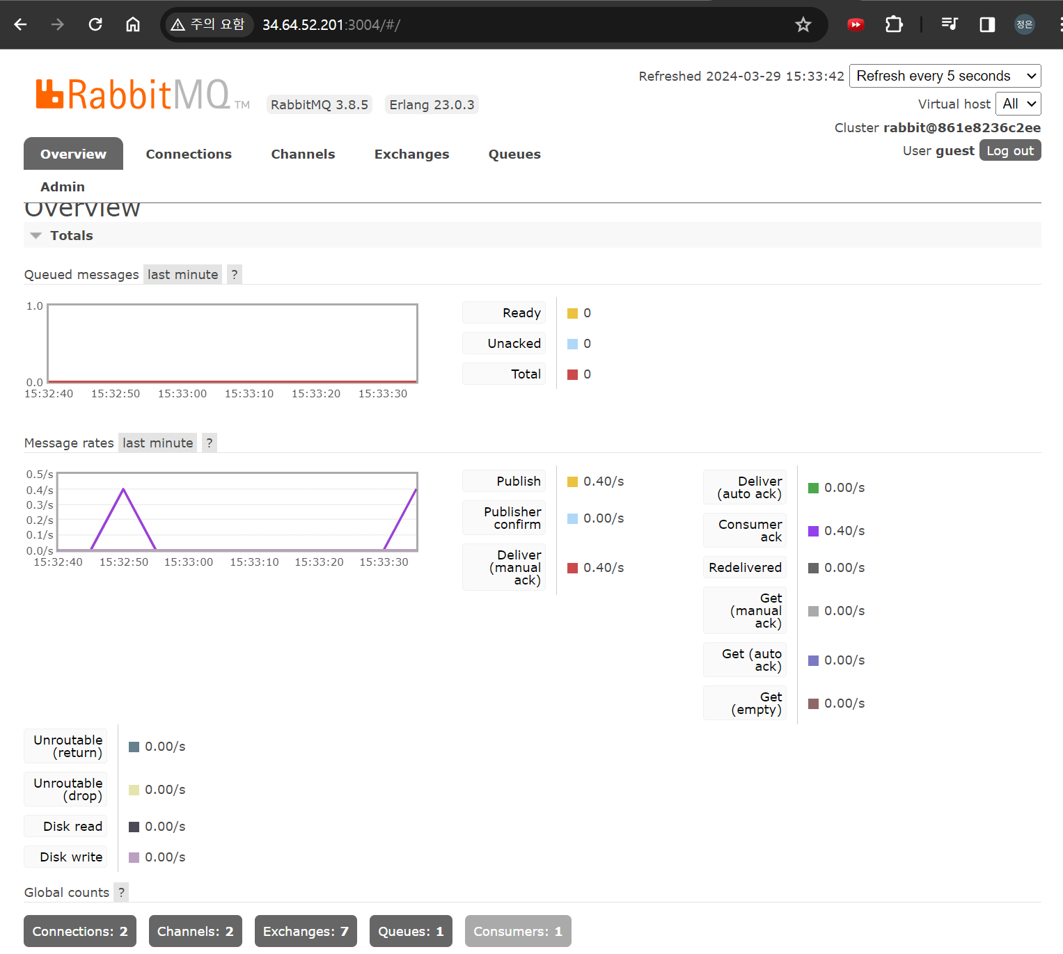 대시보드에는 queue에 얼마나 많은 메시지가 쌓여있는지 얼마나 빠르게 전송되는지 등 상태를 확인할 수 있다. 대시보드 접근은 위 도커 컴포즈 파일에 대시보드 접근용 포트인 15672의 외부 포트인 300번 포트로 접근하면 된다.