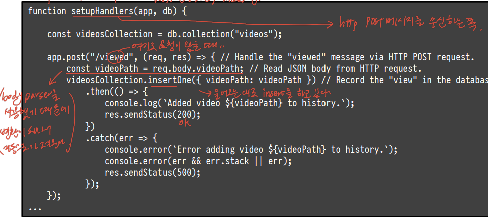 video-streaming 마이크로서비스에서 POST 요청이 오면 body-parser를 통해 자동으로 JSON 형태를 인식하여 요청이 들어오면 insert를 하여 POST 요청을 처리한다.