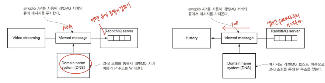 - 송신 : DNS를 통해 RabbitMQ 서버의 특정 queue에 전송