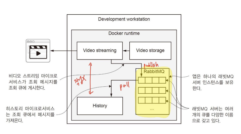 간접 메시징은 마이크로서비스 간의 "느슨한 연결"을 지원한다. 간접 메시징은 video-streaming과 history가 직접 통신하는 것이 아니라 RabbitMQ를 통해 viewed 메시지를 queue에 publish하고 hisory가 queue에서 viewed 메시지를 pull한다.