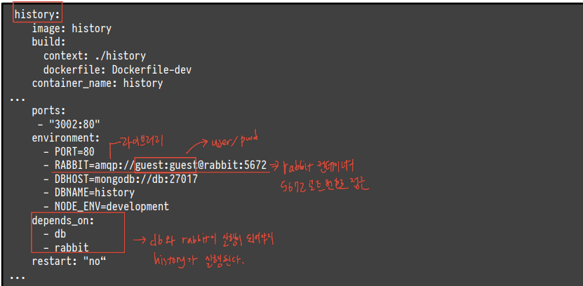 docker-compose.yml 파일에서 rabbit 연결을 위해 amap라이브러리와 대시보드를 연결하고 db와 rabbit이 실행되기 전까지 history 마이크로서비스가 실행되지 못하도록 한다. (depends_on)