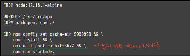또한 RabbitMQ 서버가 준비가 안 된 상태에서 마이크로서비스가 연결을 하려고 하면 오류가 발생하기 때문에 RabbitMQ 서버가 준비가 됐는지 기다리는 명령어를 dockerfile에 추가한다. (wait-port 추가)