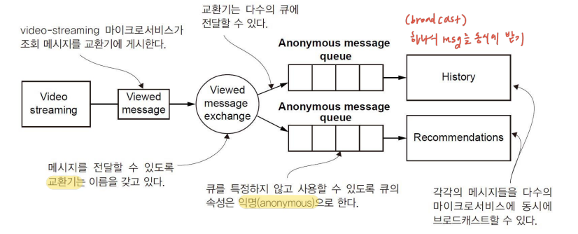 하나의 마이크로서비스가 메시지를 보내면 다수의 마이크로서비스가 수신