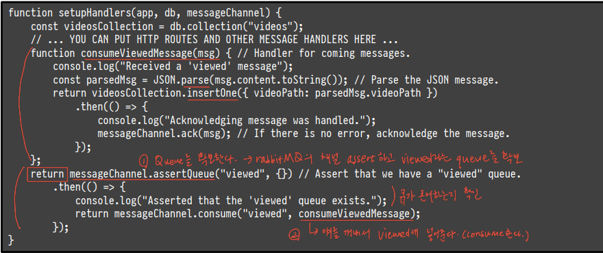 - 수신 : History 마이크로서비스는 특정 queue로부터 viewed 메시지를 가져온다.