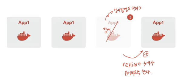 - 상태 관리 : replica를 3개로 설정하였다고 가정하였을 때, 하나의 노드에서 장애가 발생하여도 자동으로 상태를 유지되도록 해주어야 한다.