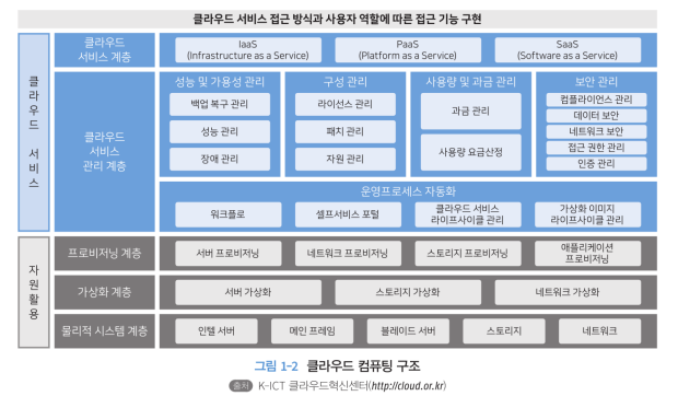 - 클라우드 서비스 관리 계층 : 제공되는 자원애 대해 전반적인 라이프 사이클 관리 & 모니터링
