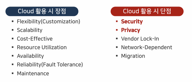 - 클라우드 제공자의 신뢰 문제 (Honest-but-Curious Cloud) -> 클라우드 제공자 자체가 고객 데이터 열람 및 분석 가능성 존재