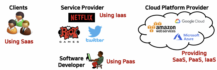 - Infrastructure as a Service (IaaS): SaaS Provider에게 Raw Computing Resource (e.g., VM, Storage, Network...)에 대한 사용료를 받고 Infra를 제공합니다. (e.g., Amazone AWS)
