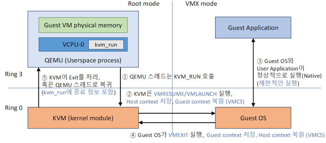 - 실행 흐름의 제어는 VM 종료 시에 KVM/Host OS로 이동