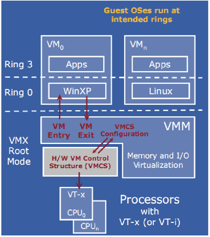 - VMM은 Ring 0에서 VMX mode로 진입하여 Guest OS 실행하며 Trap 발생 시 VMM으로 제어권이 이동