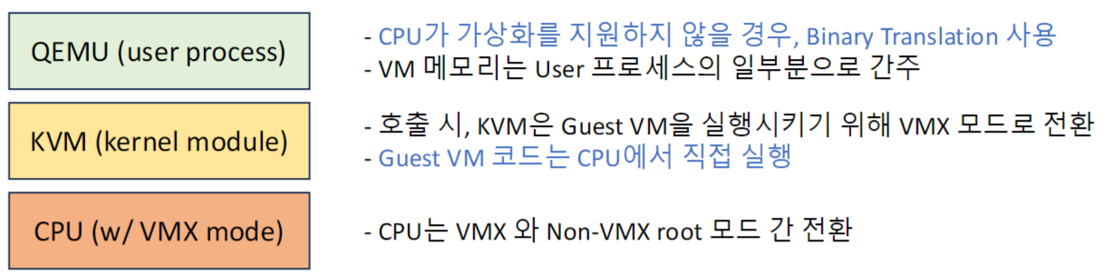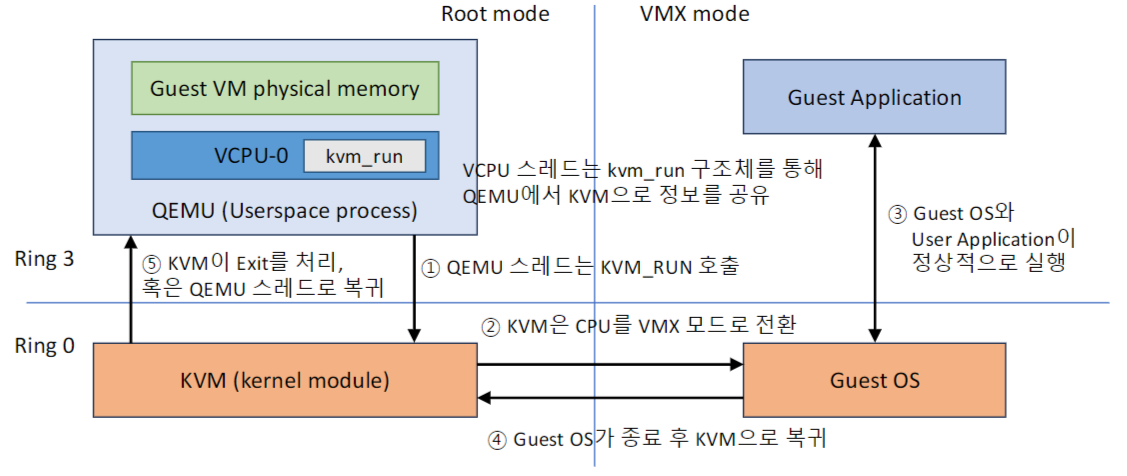 - 실행 흐름의 제어는 VM 종료 시에 KVM/Host OS로 이동