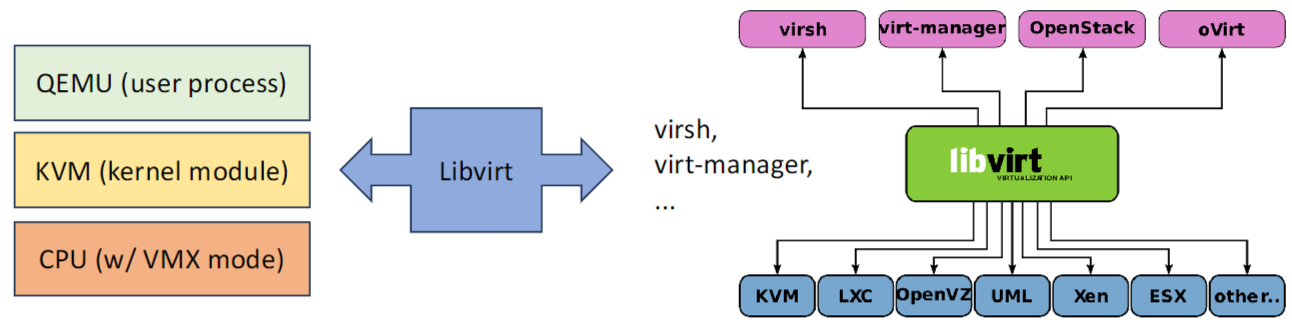 Linux에 KVM/QEMU를 설치하면 libvirt도 함께 설치를 해야 한다. libvirt는 Red Hat에 만든 open source로, hypervisor를 관리하기 위한 도구/API 집합이다.