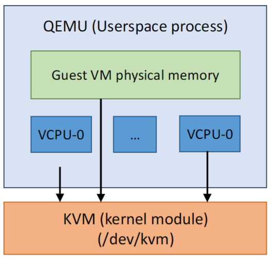 - QEMU의 VCPU 스레드는 KVM 커널 모듈에 KVM_RUN 명령어를 제공