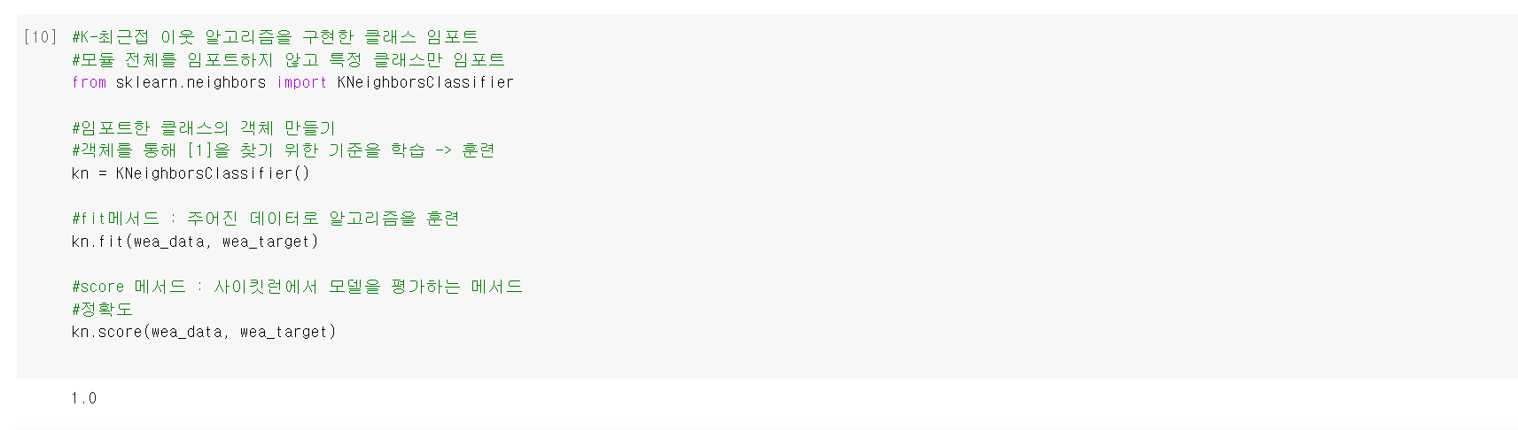 ํด๋ž˜์Šค๋ฅผ ์ž„ํฌํŠธ ํ•œ ํ›„, ํด๋ž˜์Šค์˜ ๊ฐ์ฒด๋ฅผ ์ƒ์„ฑ. ํด๋ž˜์Šค ๊ฐ์ฒด๋ฅผ kn์œผ๋กœ ๋‘๊ณ  fit () ๋ฉ”์„œ๋“œ๋กœ ํ›ˆ๋ จ. (๋ชจ๋ธ์— ๋ฐ์ดํ„ฐ๋ฅผ ์ „๋‹ฌ)